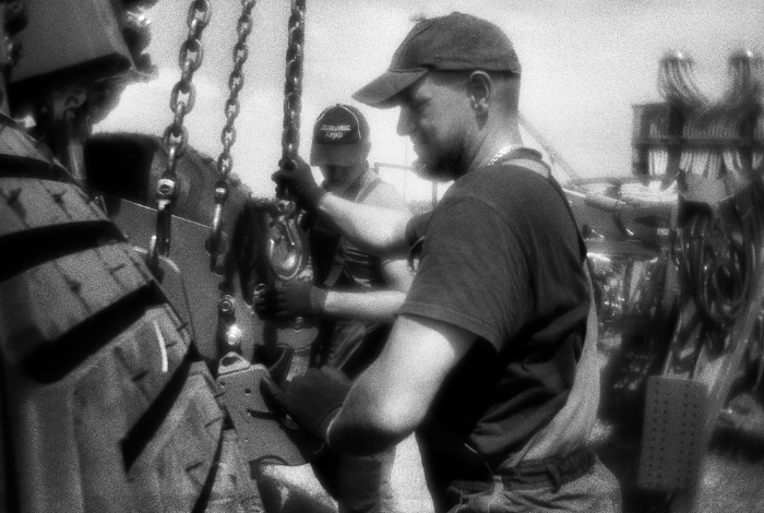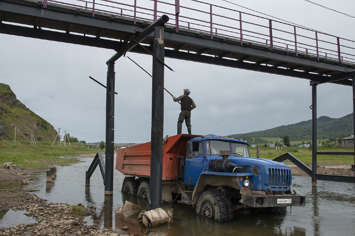 Чоя, Республика Алтай | Choya, Altai Republic, 2021. The workers drove the truck into the river and use it as a platform for painting the bridge. Choya settlement, Altay region, Russia, 21.06.2021
