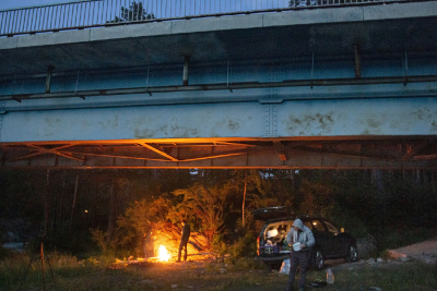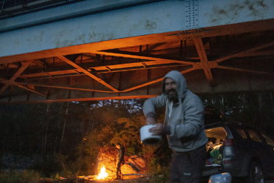 Чоя, Республика Алтай | Choya, Altai Republic, 2021. The workers drove the truck into the river and use it as a platform for painting the bridge. Choya settlement, Altay region, Russia, 21.06.2021