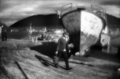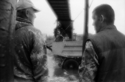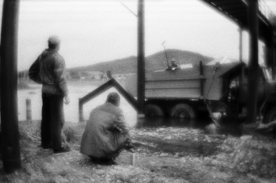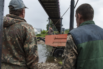 Чоя, Республика Алтай | Choya, Altai Republic, 2021. The workers drove the truck into the river and use it as a platform for painting the bridge. Choya settlement, Altay region, Russia, 21.06.2021